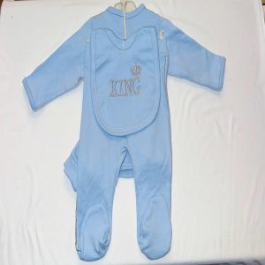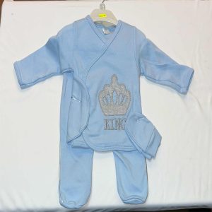 Dress your little prince in style with our 5 Piece Baby Boys “King” Outfit Set, designed in soft sky blue