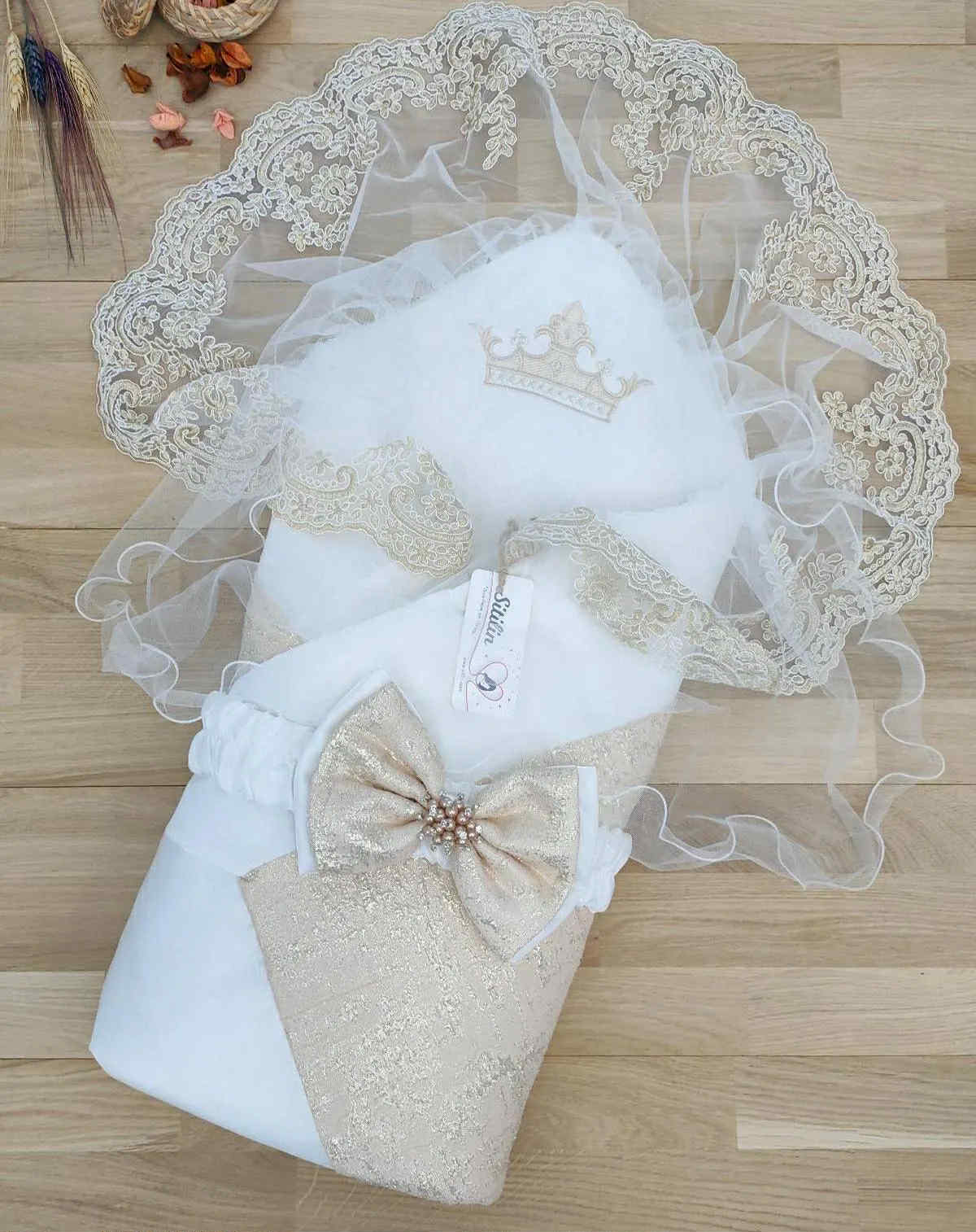 Wrap your newborn in elegance and comfort with our Luxury Baby Swaddle Blanket, designed for parents who want only the best for their little one. Featuring an intricate golden lace trim, a delicate embroidered crown, and a shimmering bow with pearl accents, this swaddle brings a touch of royalty to every moment.