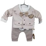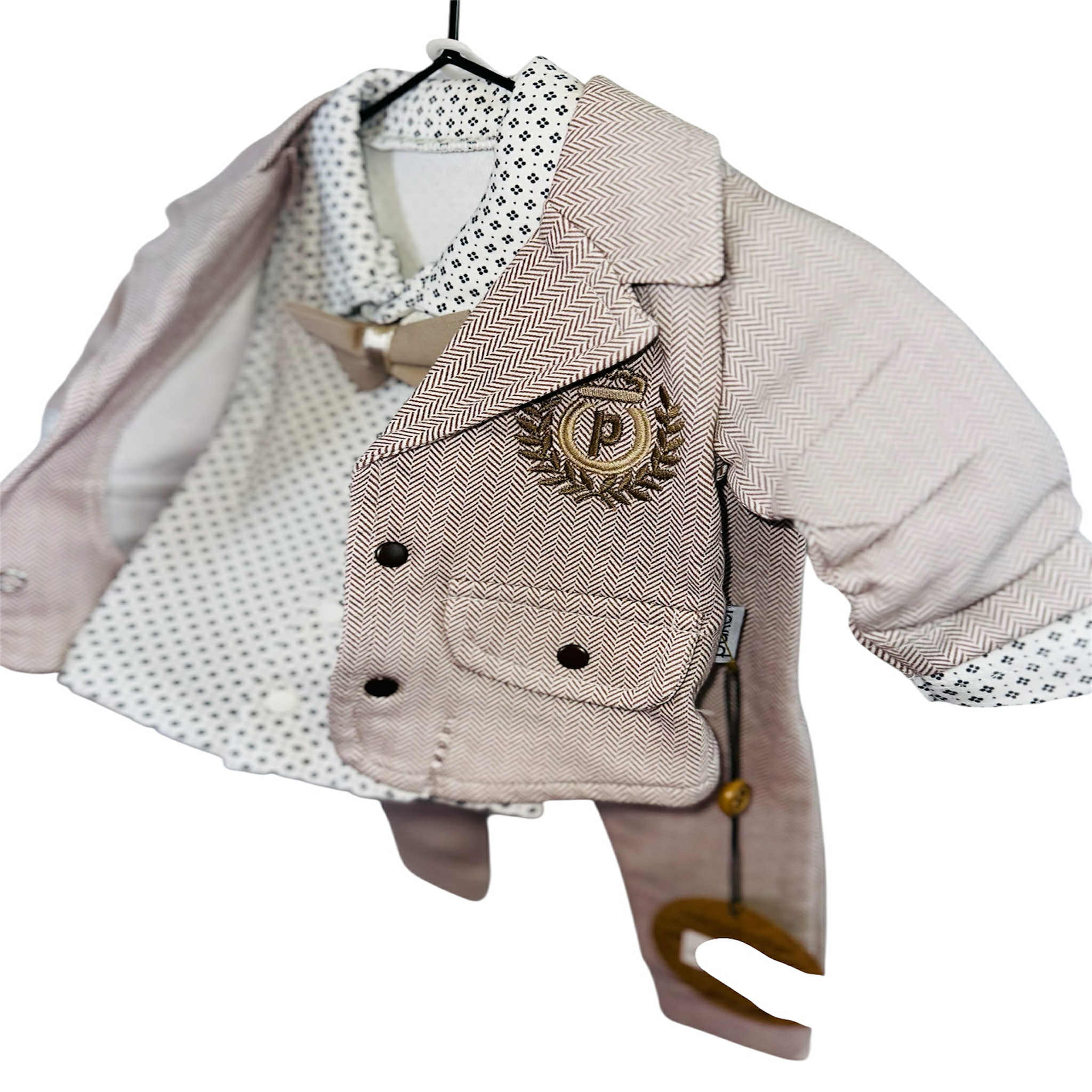 Dress your little prince in timeless elegance with our Baby Gentleman Suit. This 3-piece set includes a soft herringbone jacket with decorative pockets, matching trousers, and an inner shirt with a stylish bow tie. Perfect for weddings, christenings, birthdays, or any special occasion, this outfit combines comfort with sophistication.