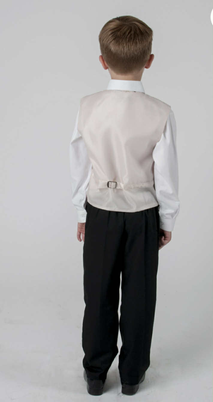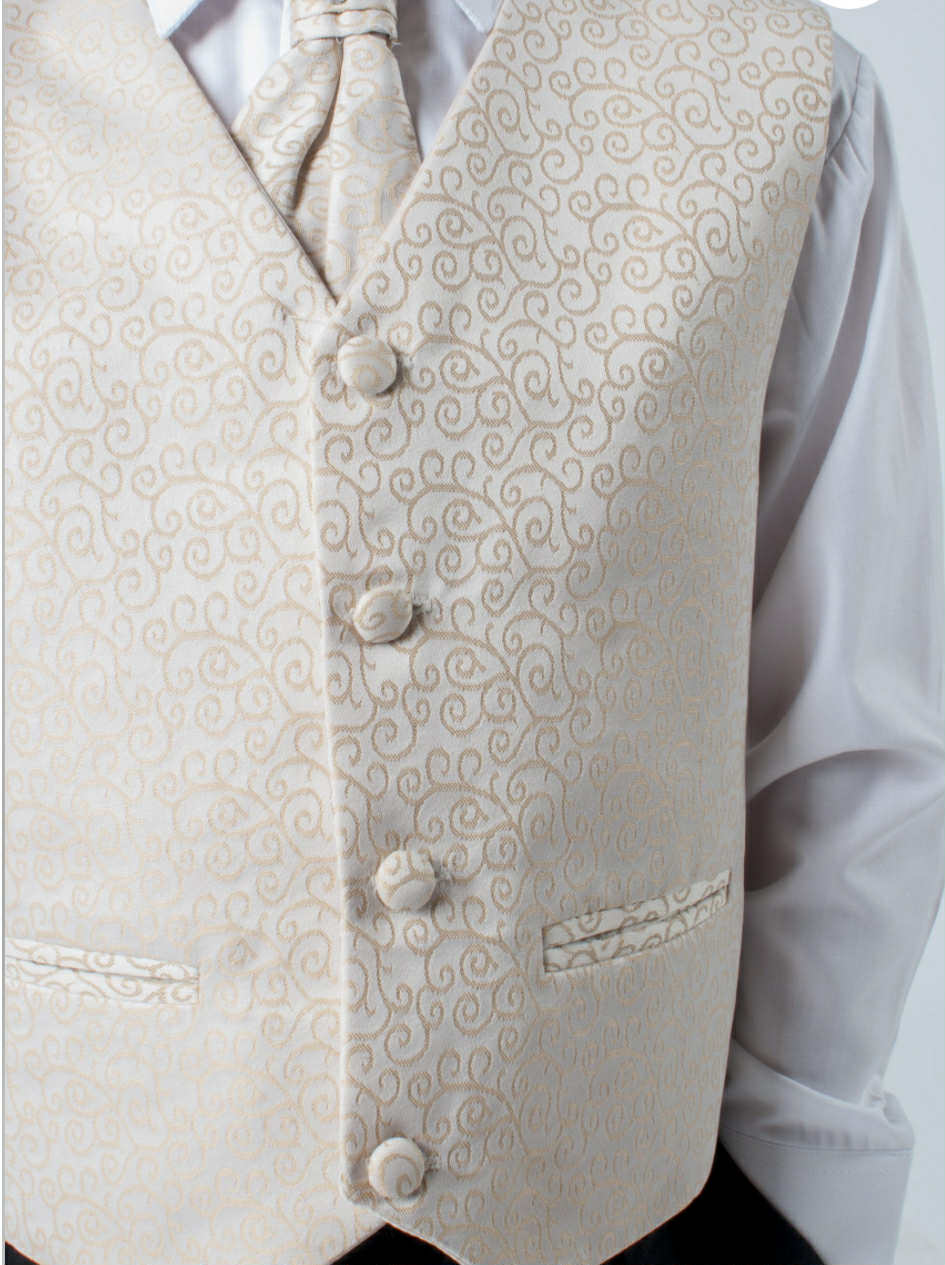 • Champagne Swirl Waistcoat – featuring intricate stitched swirl patterns with a silver clasp at the back for adjustable fitting.